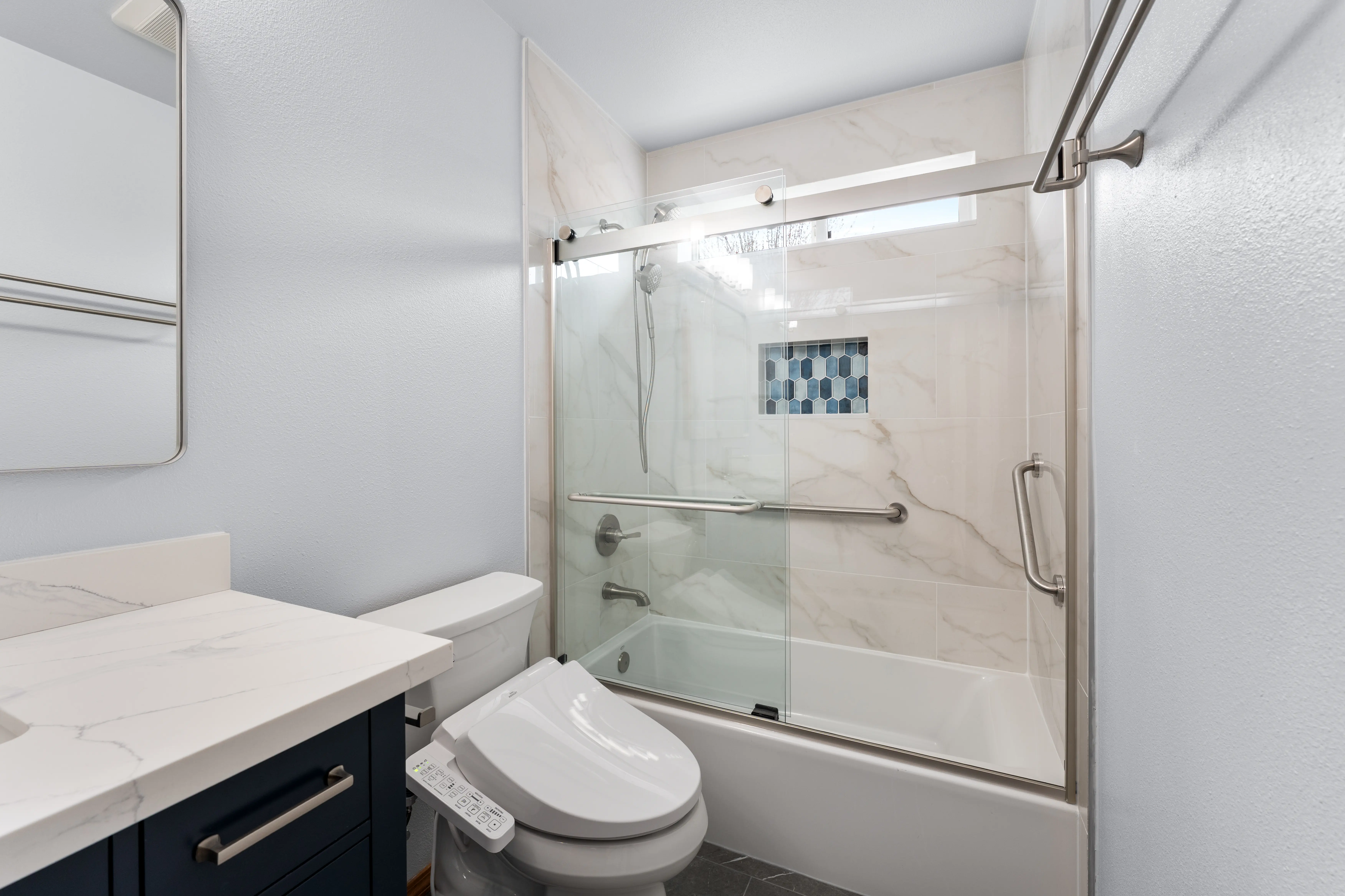 One of the bathrooms was in such poor condition that it was completely unusable. We gutted the space and rebuilt it from scratch with a new bathtub, vanity, mirror, and toilet, creating a clean and functional bathroom that fits the rest of the remodeled home.