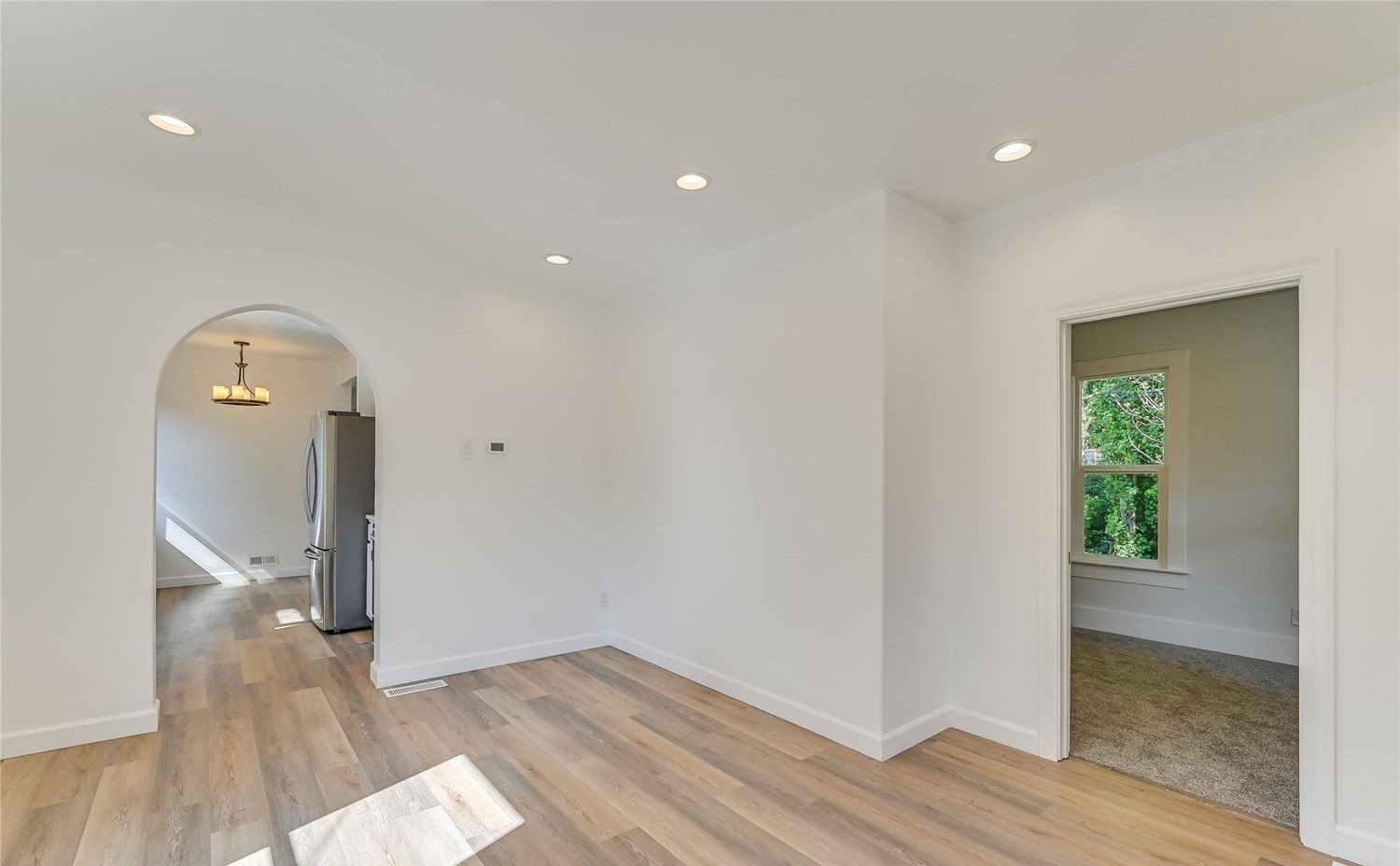 We started by stripping the home down and removing decades of outdated finishes. Old drywall and layers of wallpaper from the 1980s were removed throughout the house. From there, we rebuilt the interior with fresh drywall, new LVP flooring throughout the home, updated lighting, and a fully remodeled kitchen featuring new cabinetry, countertops, and GE appliances.