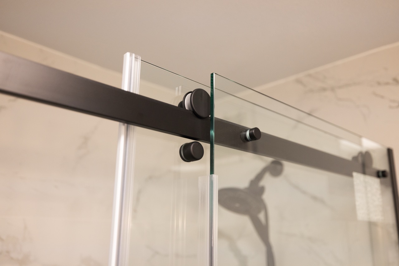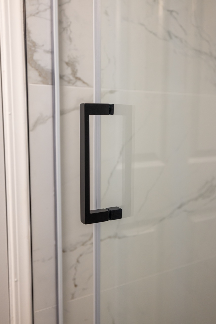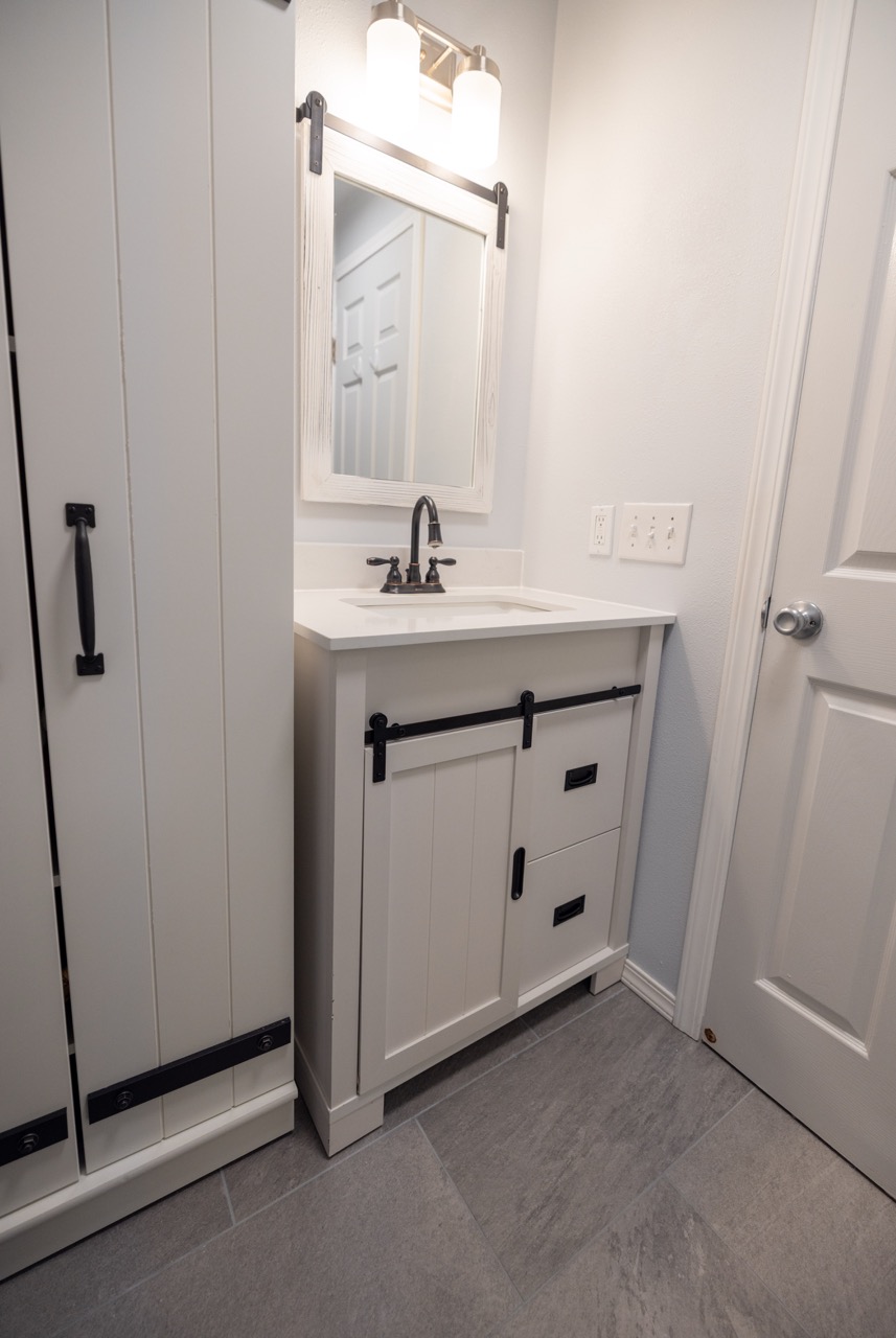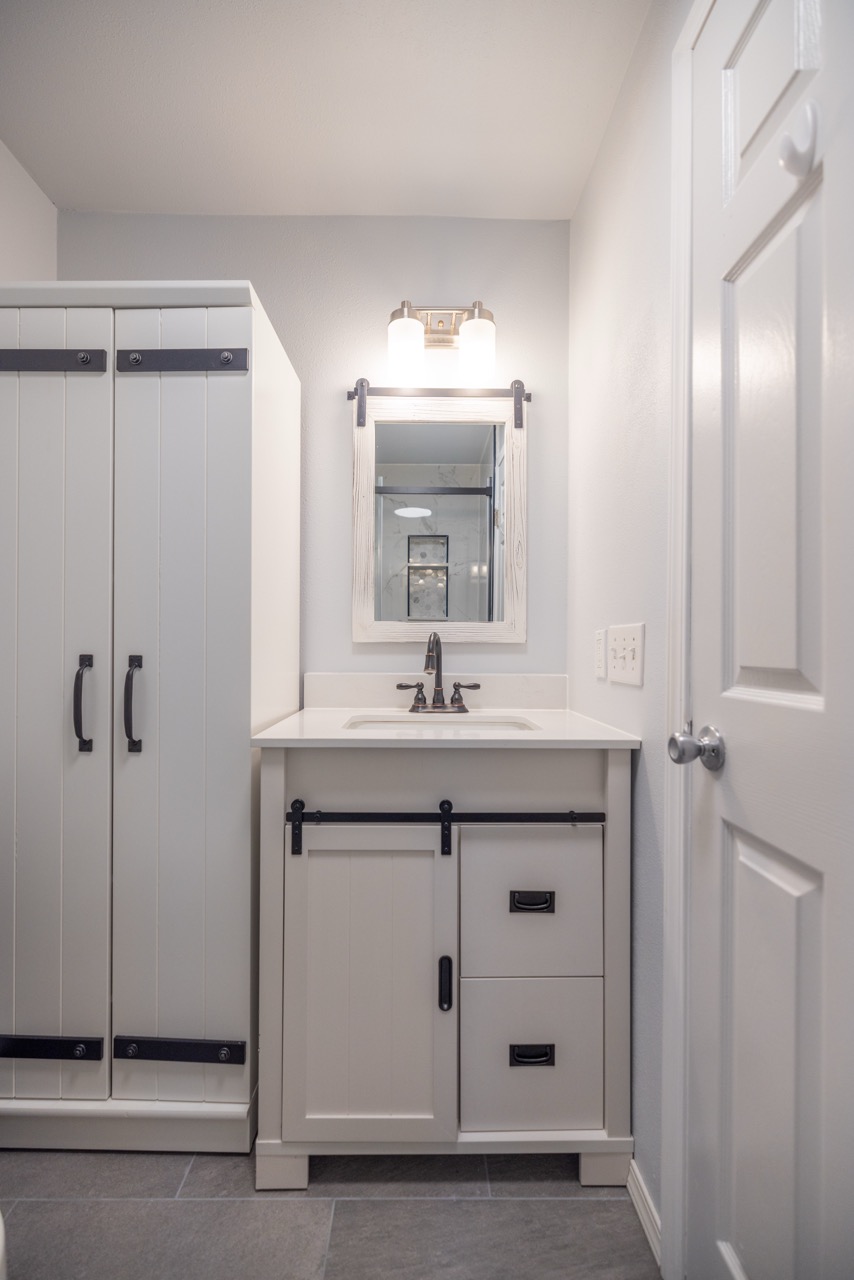 We installed a new white vanity with matching storage cabinetry and black farmhouse-style hardware to complement the matte black fixtures. The result is a crisp, modern bathroom that feels twice the size of the original space.
