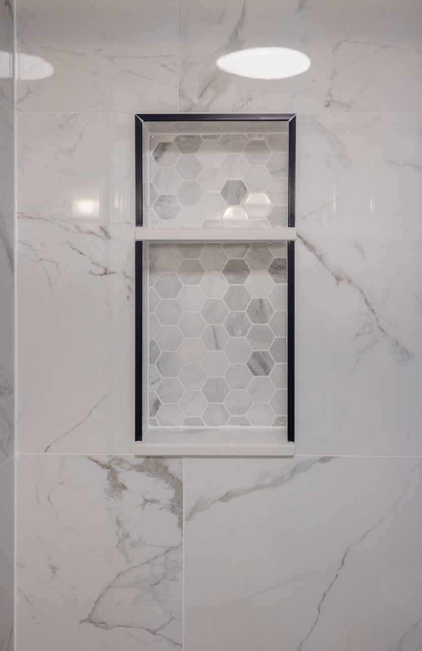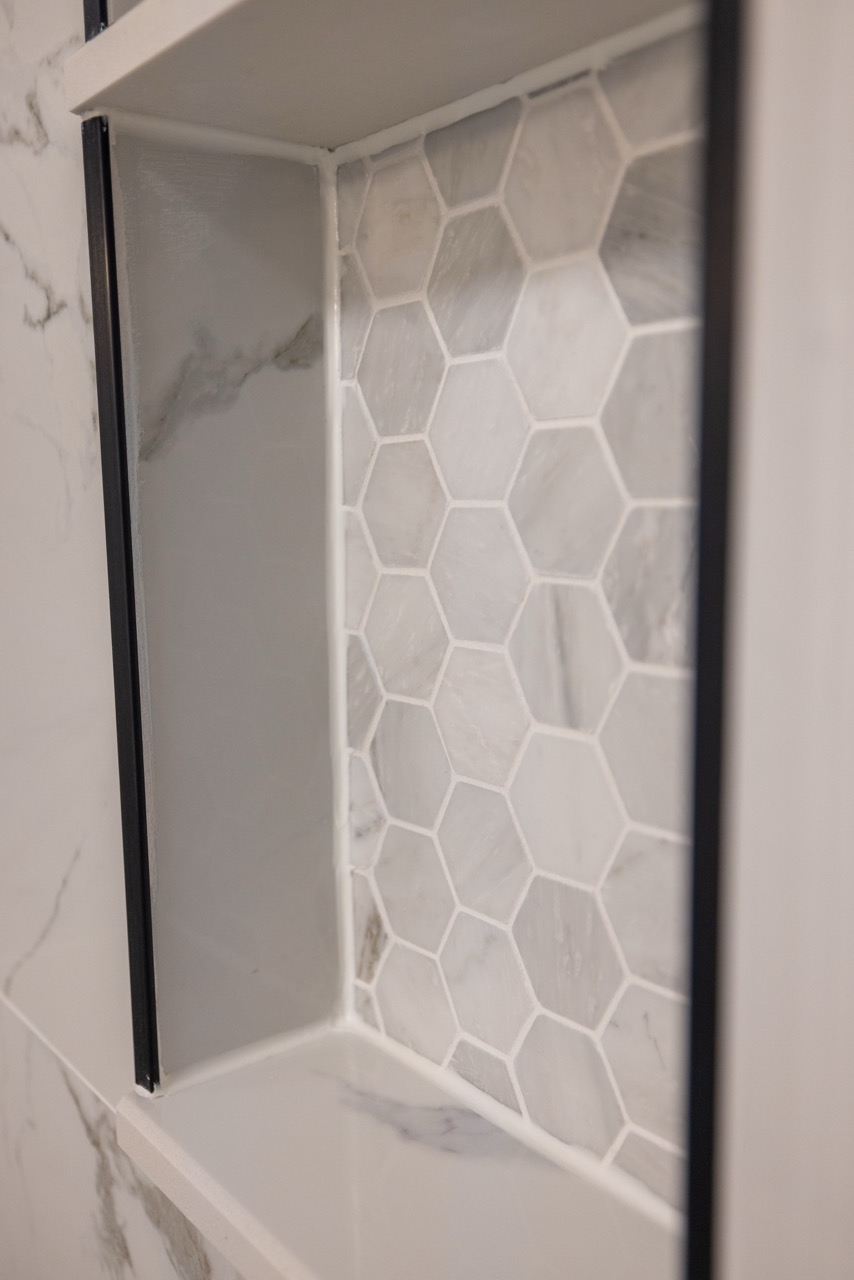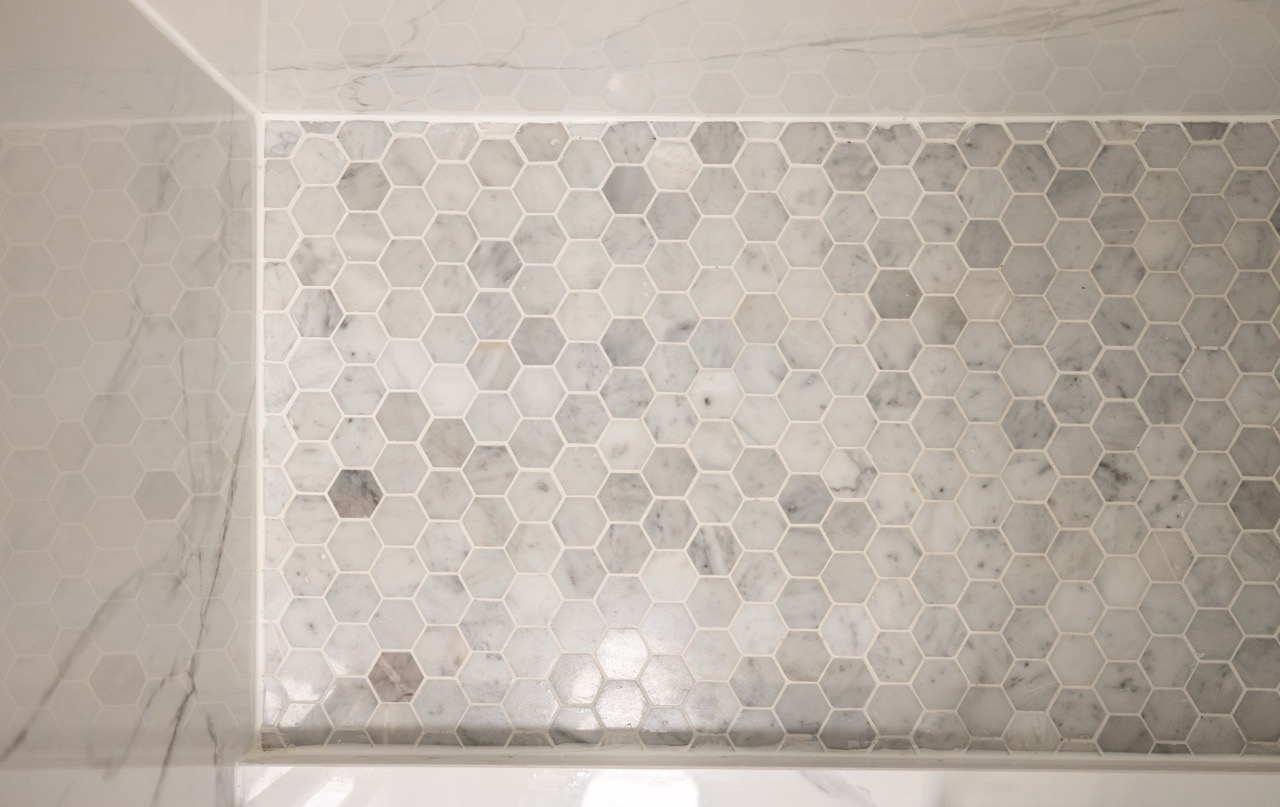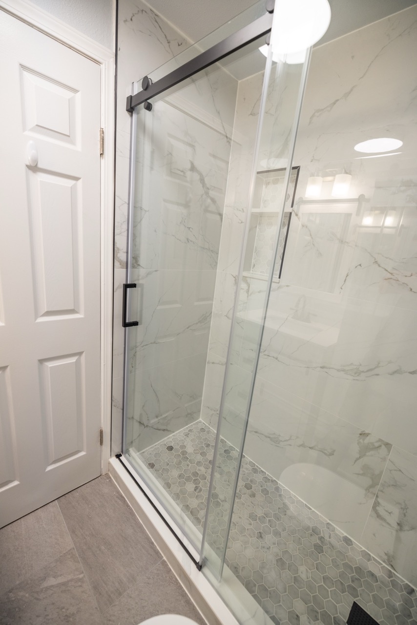 The original bathroom had a tight layout and an outdated bathtub that wasn’t practical for the homeowners. We removed the tub and built a walk-in shower with large-format Carrara-style porcelain tile, giving the space a brighter and more elegant feel. The new hex tile flooring ties the design together while offering great durability.