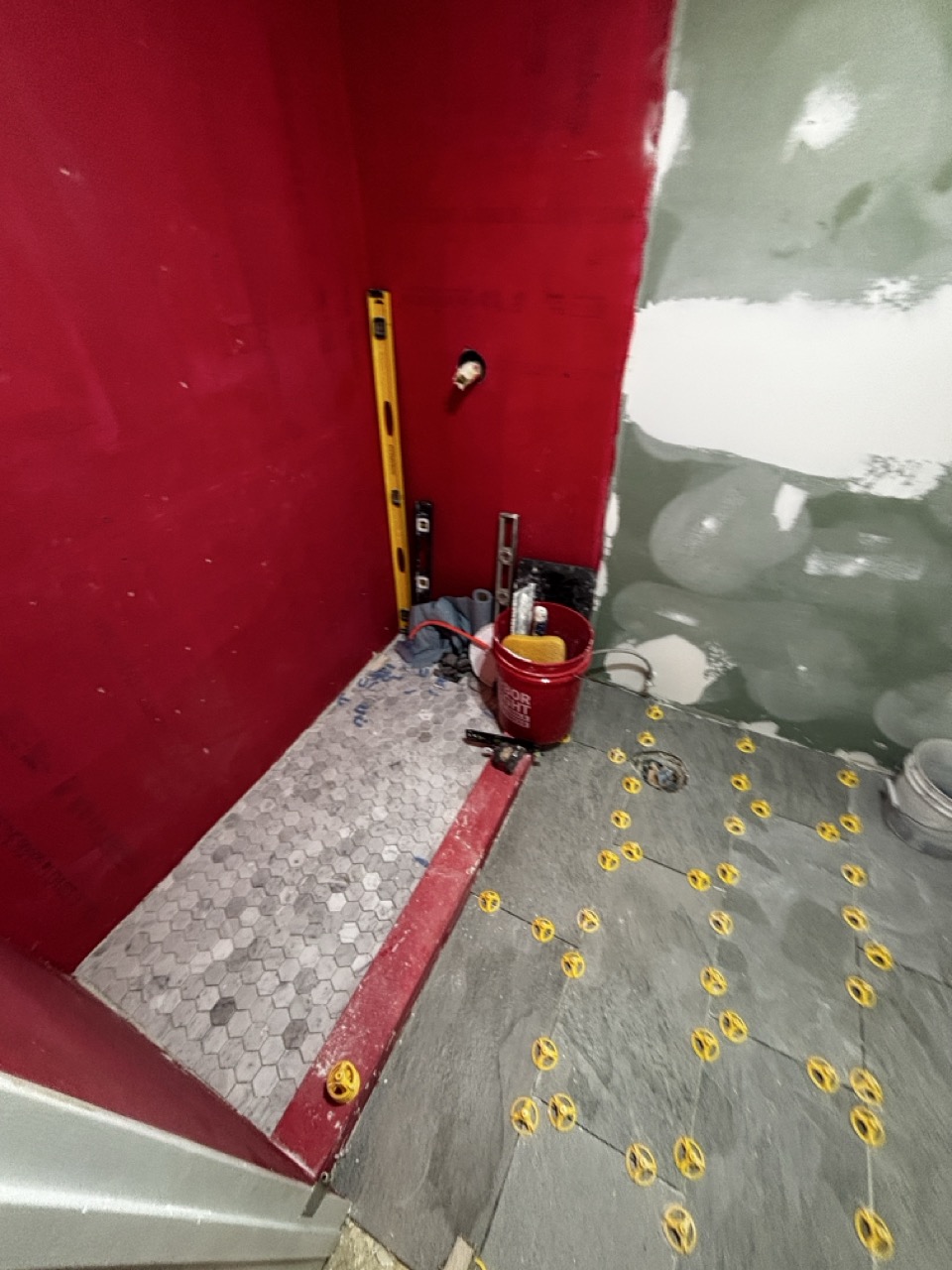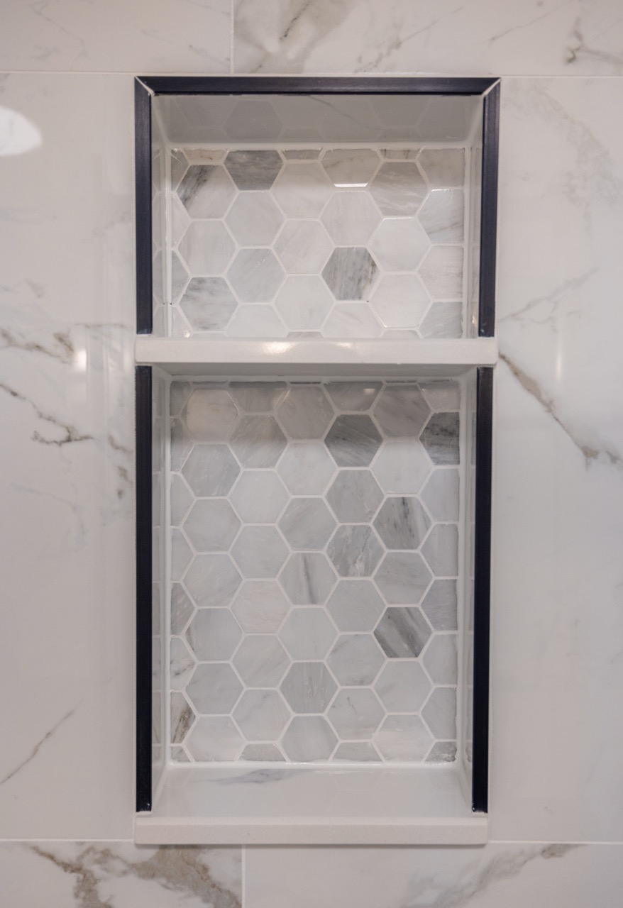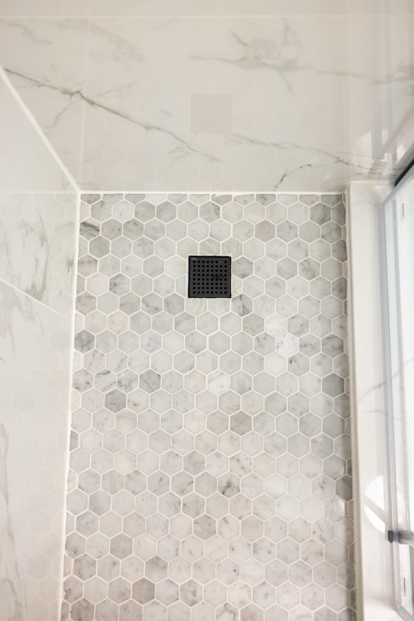The original bathroom had a tight layout and an outdated bathtub that wasn’t practical for the homeowners. We removed the tub and built a walk-in shower with large-format Carrara-style porcelain tile, giving the space a brighter and more elegant feel. The new hex tile flooring ties the design together while offering great durability.