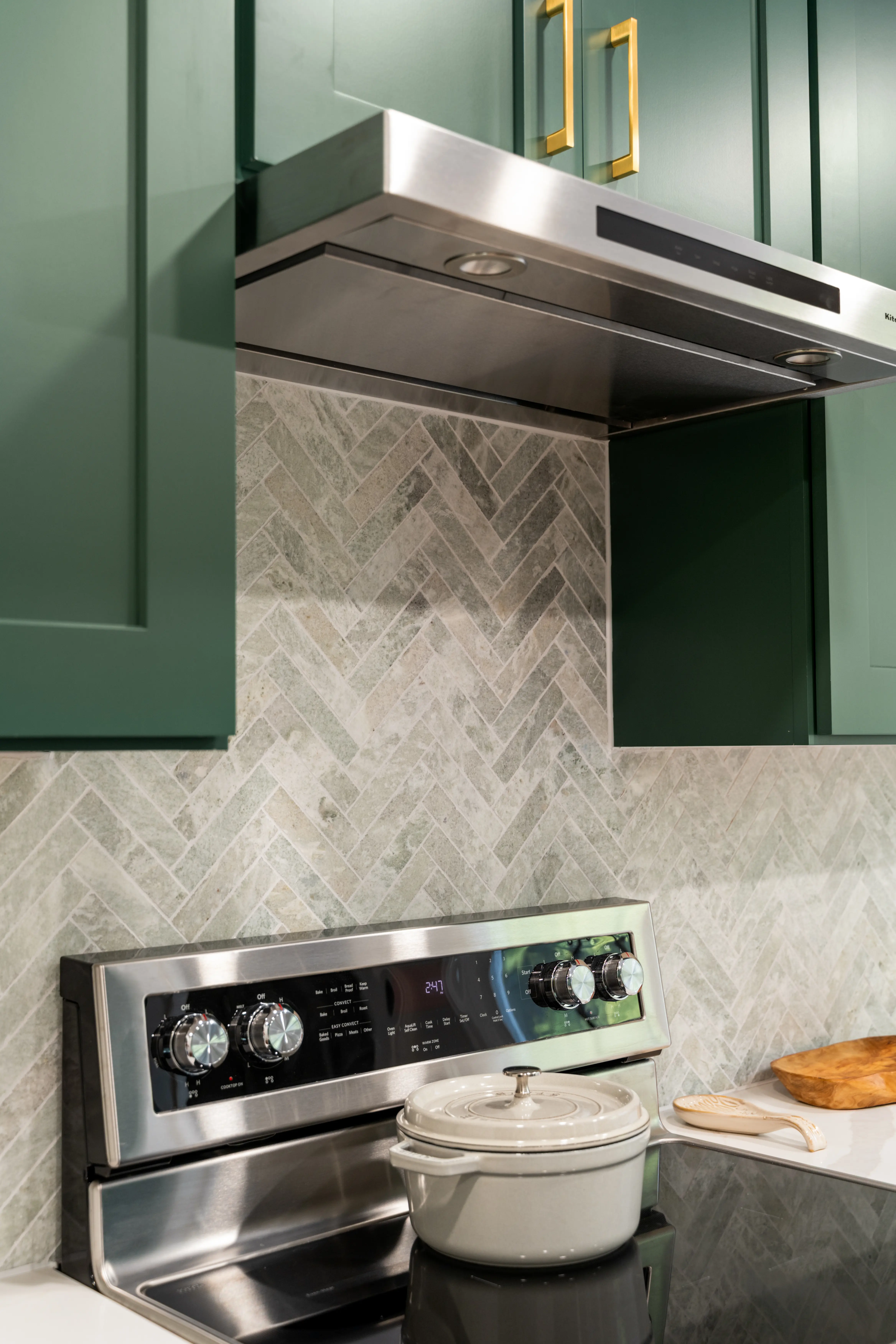 The homeowners chose a natural stone backsplash installed in a herringbone pattern, which adds texture and complements the cabinet color beautifully.
