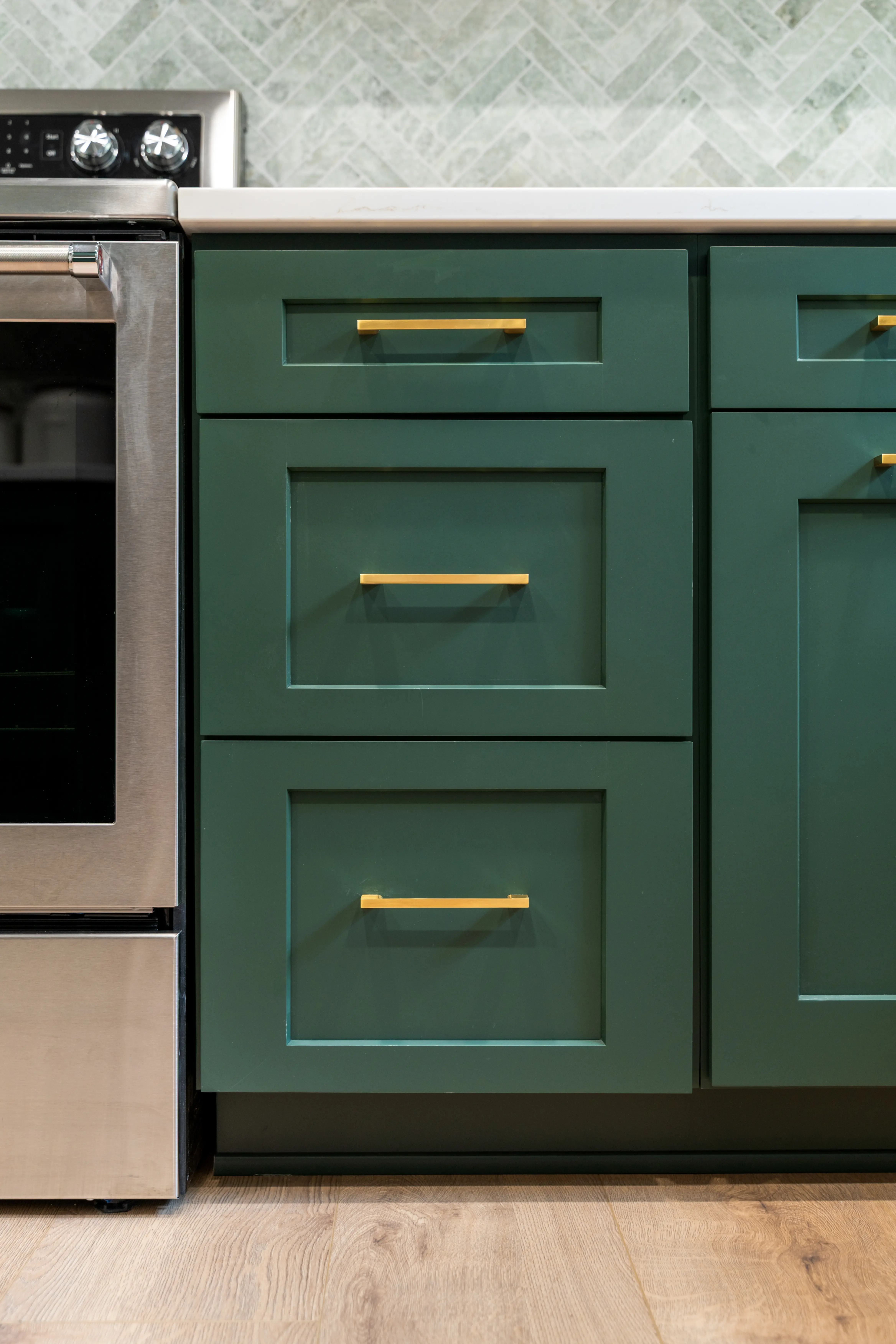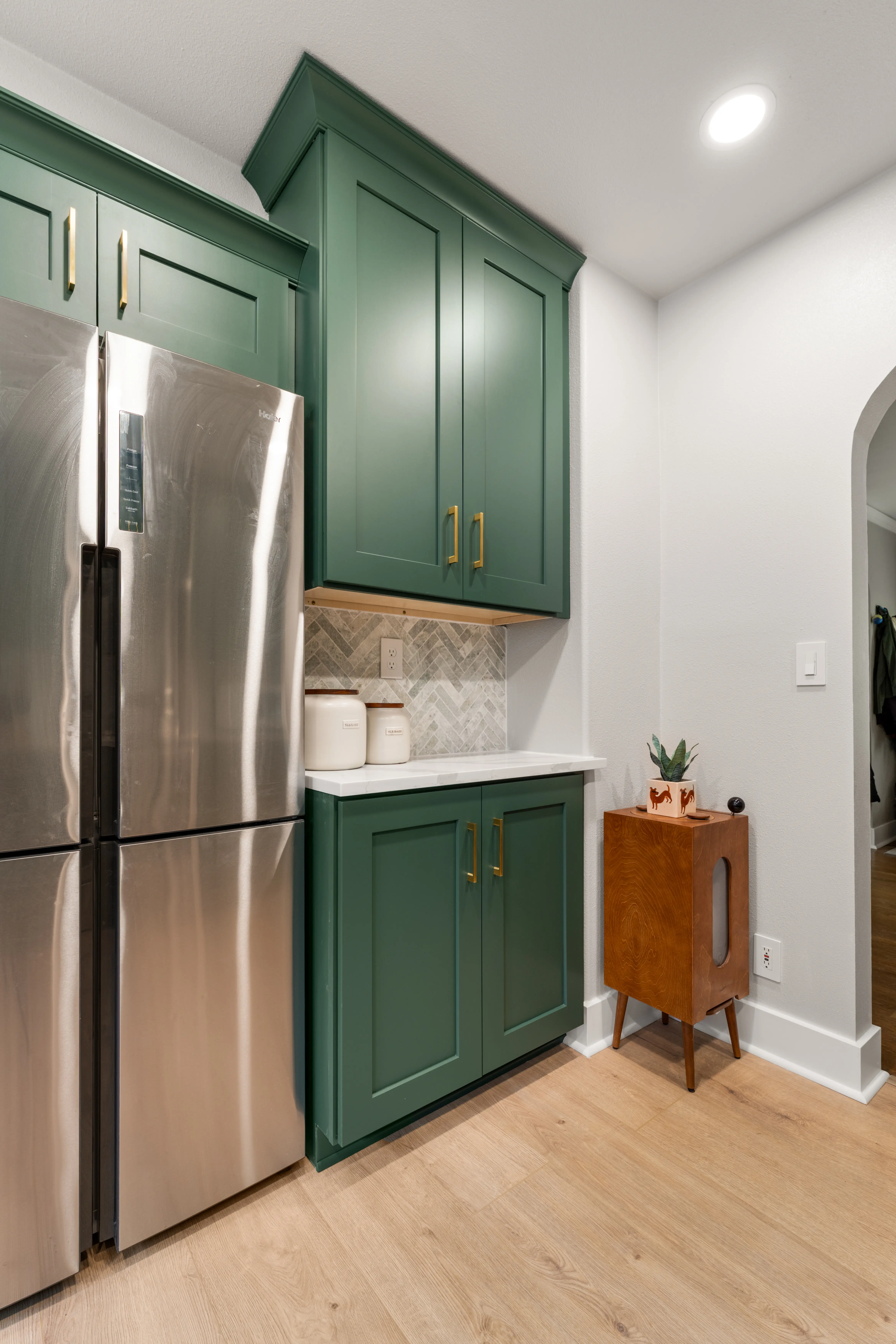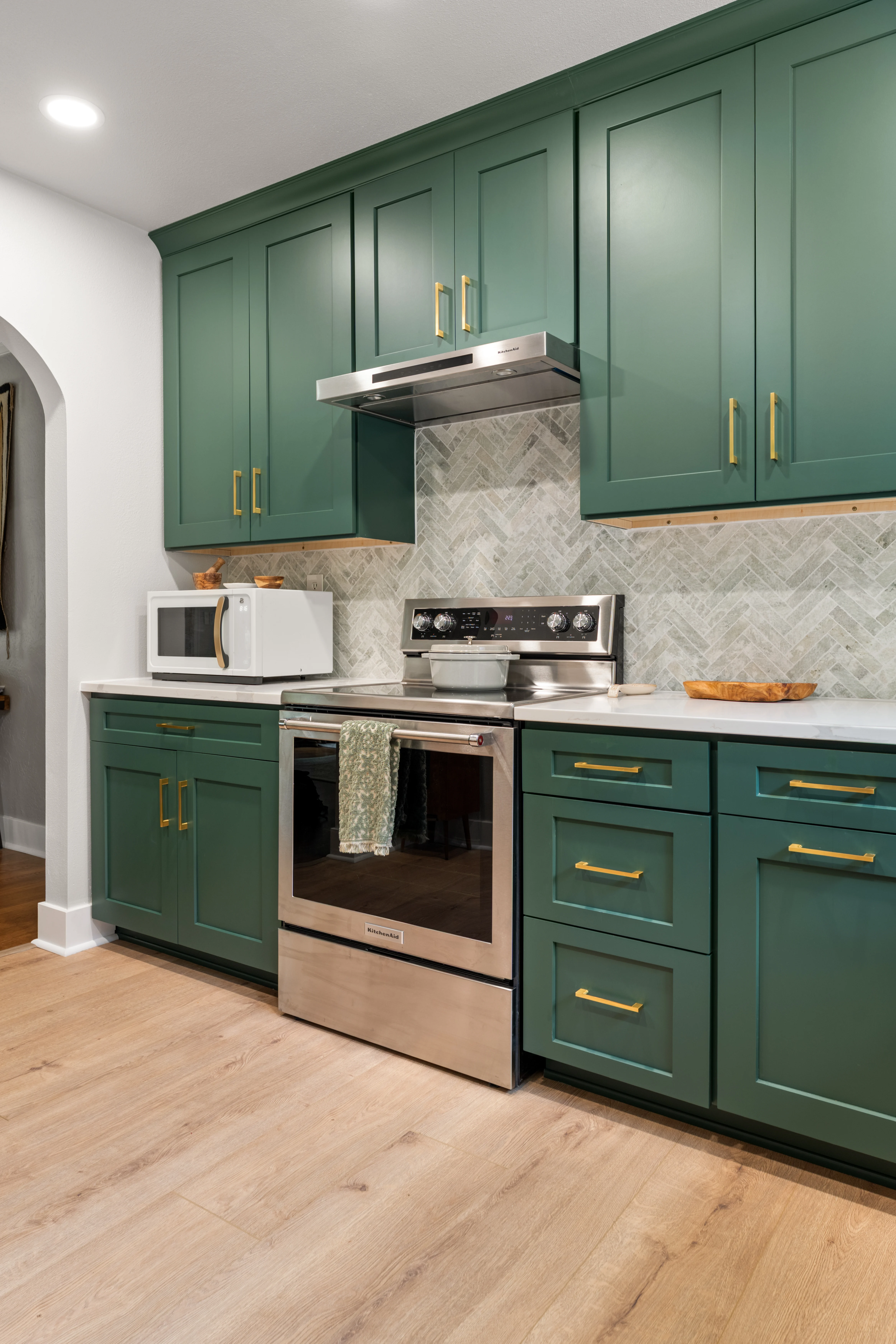 Next, we installed brand new flooring throughout the kitchen and built a full wall of custom cabinetry. The deep green cabinets bring warmth and character to the space, while the gold hardware adds contrast and detail.
