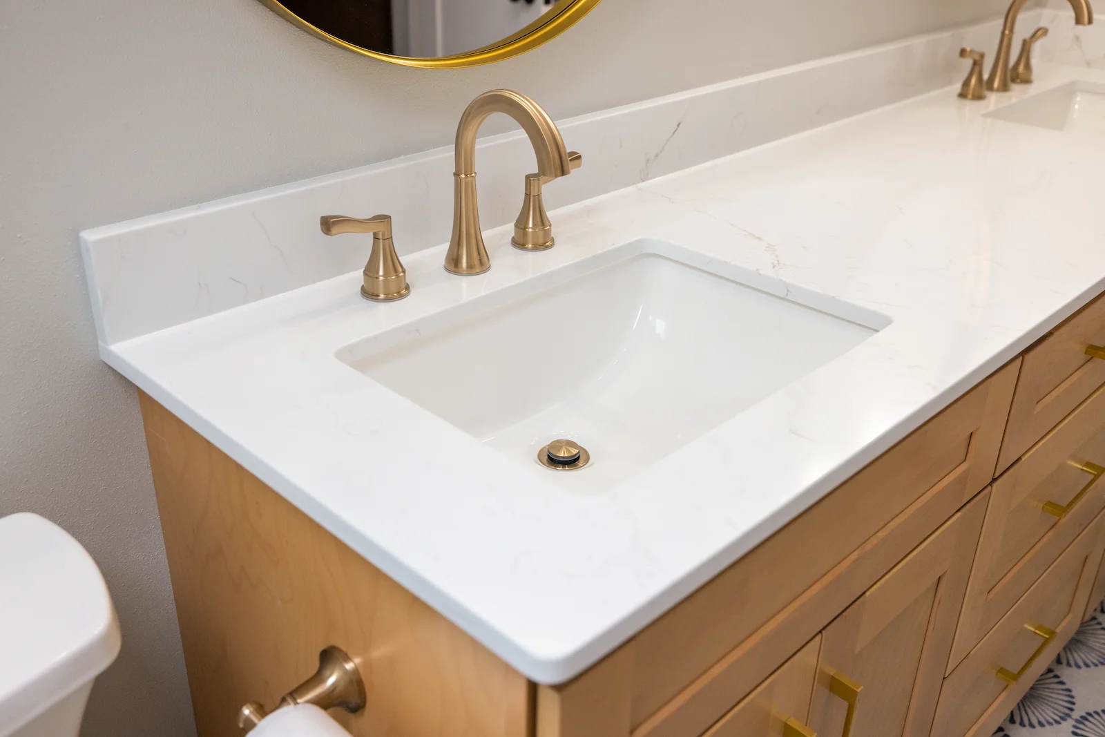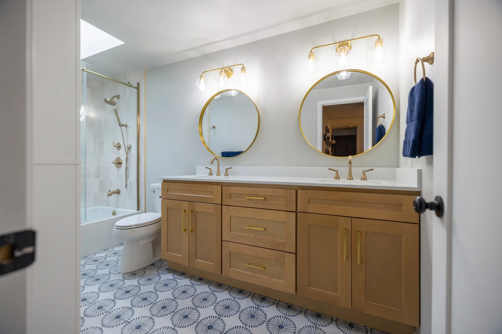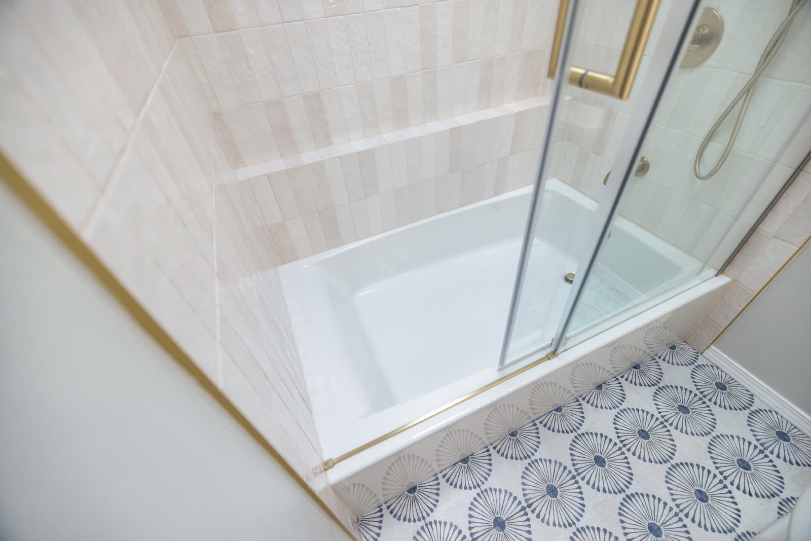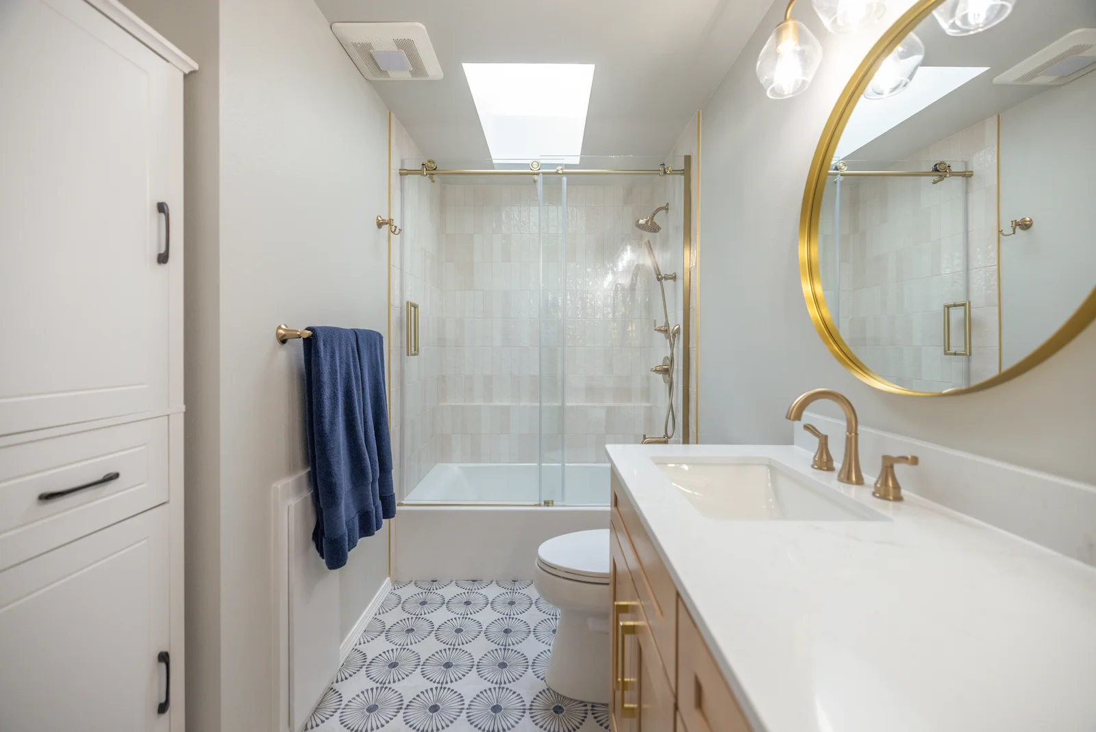 The homeowners came into this project knowing exactly what they wanted. They were ready to say goodbye to their dark brown bathroom and transform it into a space that felt lighter, cleaner, and more inviting. White finishes and gold accents were the foundation of the design, with a touch of blue tile on the floor to add personality and depth.